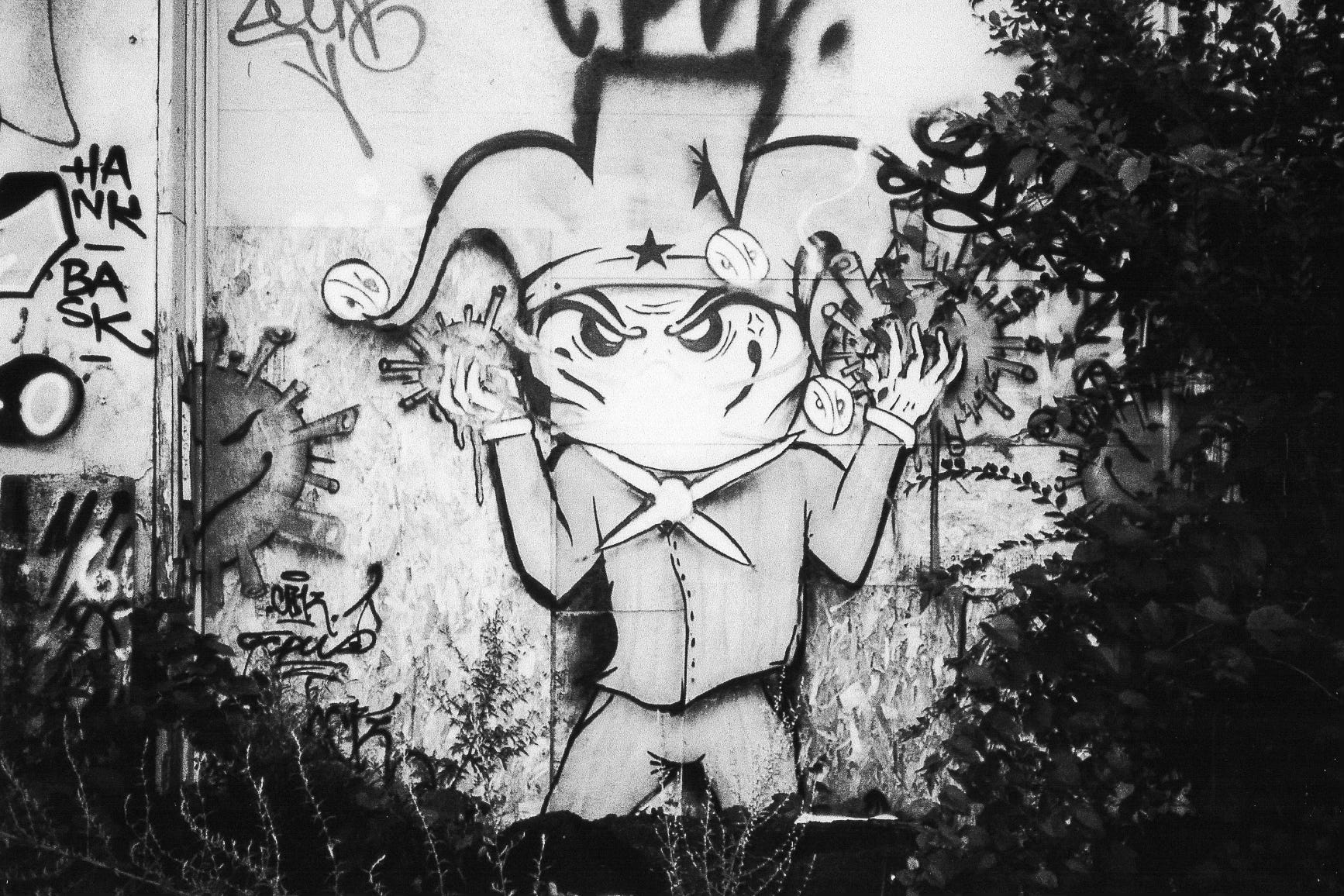 This sequence is a short passage in the sequence that shows the Mayor approaching me with the shovel in his hand, followed by a jester painted on a nearby garage door, and then a photo of the Mayor with his back to me, drinking a beer and revealing a patch on the back of his denim vest of a jesters hat.