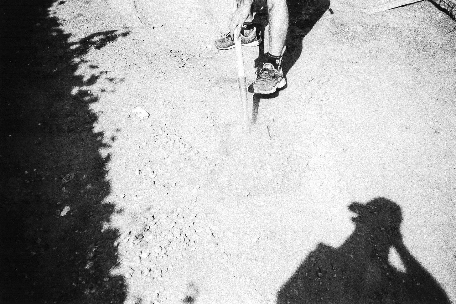 In this section, we can feel my involvement in the Mayor’s activities through my proximity to him and the inclusion of my shadow. This implies my part in shovelling dirt into the plastic trash can (which I was doing in between taking photos) with him or at least displaying a relationship to the person being photographed by my proximity.